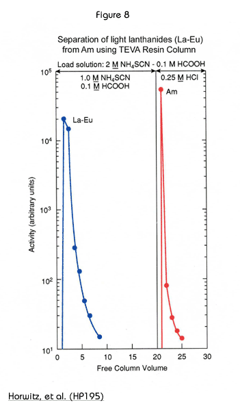 Another interesting use of the TEVA Resin is to separate americium from the rare earth elements. Figure 8 shows that the rare earths may be eluted as a group in a load solution of 1.0 M ammonium thiocyanate and 0.1 M formic acid. Americium is retained under these conditions and can be eluted later with hydrochloric acid. Although Figure 8 shows the elution of Am with 0.25M HCl, it has been later shown that 2M HCl provides a more effective and reproducible recovery of Am from TEVA resin following loading from thiocyanate. A complete step by step method for the actinide/rare earth separation is provided in Eichrom methods SPA03 and SPA03VBS.